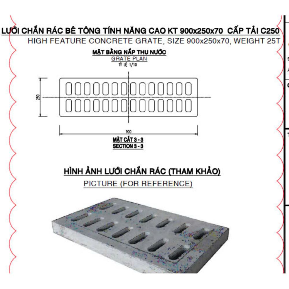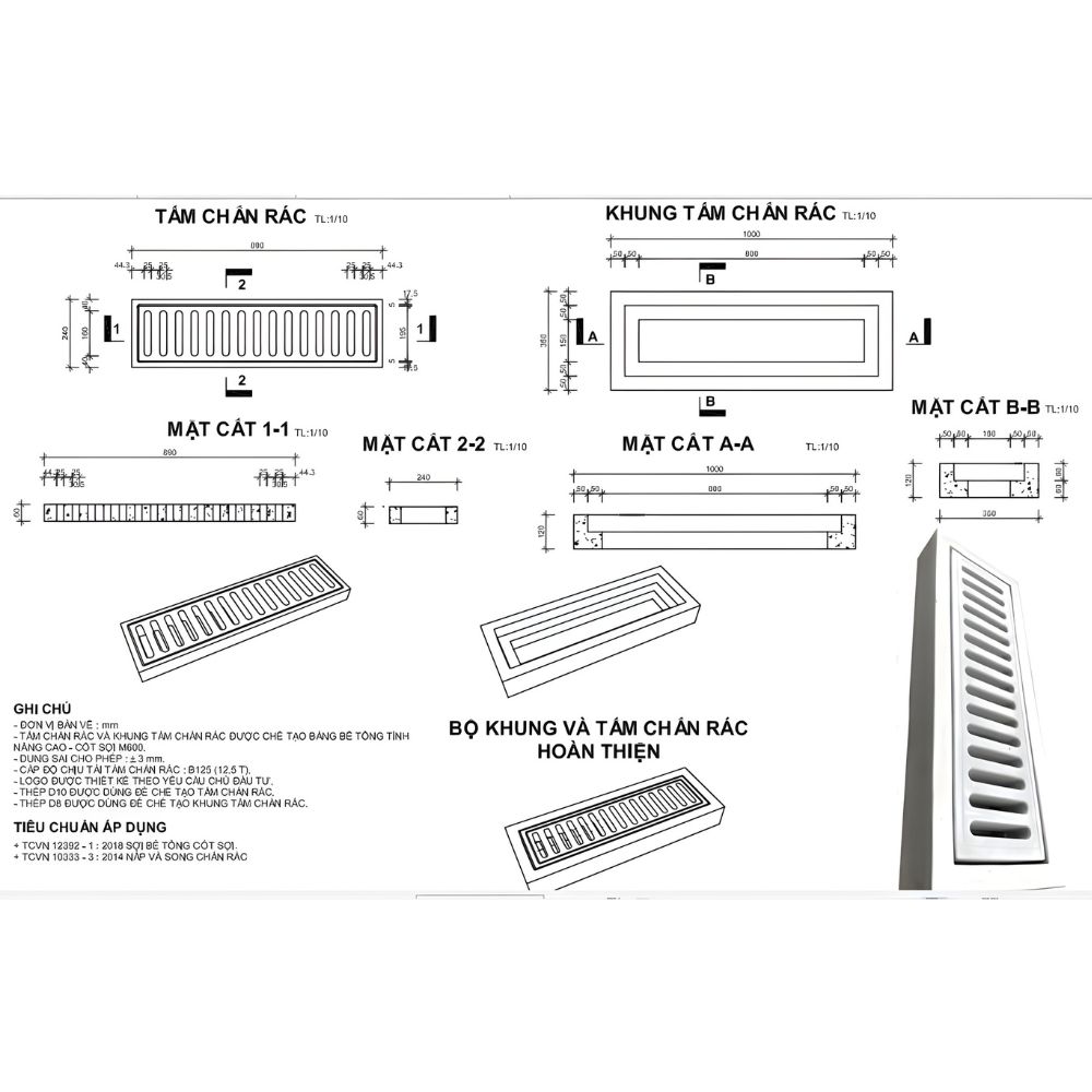 * Bản vẽ kỹ thuật chi tiết kích thước của bộ tấm chắn rác và khung đi kèm, được chế tạo từ bê tông cốt sợi thủy tinh theo các tiêu chuẩn TCVN hiện hành và có khả năng chịu tải B125 (12.5 tấn). Tấm chắn rác có kích thước tổng thể 800 mm chiều dài và 440 mm chiều rộng, với chiều dày khoảng 30-40 mm bao gồm cả các gân tăng cứng phía dưới; các khe thoát nước có chiều rộng khoảng 18-20 mm. Khung tấm chắn rác có kích thước phủ bì 1000 mm chiều dài và 600 mm chiều rộng, với kích thước lọt lòng (nơi đặt tấm chắn rác) là 800 mm x 440 mm và chiều cao tổng thể 80 mm, trong đó phần vai đỡ tấm chắn rác cao khoảng 30 mm. Các kích thước này cho thấy sự đồng bộ giữa tấm chắn rác và khung, đảm bảo tấm chắn rác được đặt khít và ổn định trong khung khi lắp đặt và sử dụng.