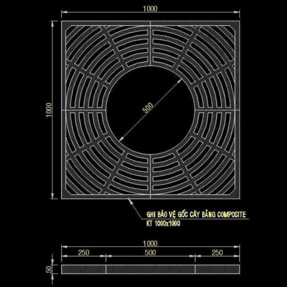 Mẫu ghi bảo vệ gốc cây này có thiết kế hình vuông, được lắp ghép từ 2 mảnh chữ nhật đối xứng, giúp dễ dàng thi công. Ghi gốc cây có kích thước tổng thể là 1190×1190mm và một lỗ tròn trồng cây lớn ở trung tâm với đường kính ∅500mm. Điểm nhấn thẩm mỹ là họa tiết dây bện được khắc âm 2mm trên viền ngoài và bốn lỗ tròn trang trí ∅100mm ở các góc. Đây là một thiết kế cao cấp, vừa bảo vệ cây hiệu quả vừa tăng tính mỹ quan cho các công trình hiện đại.