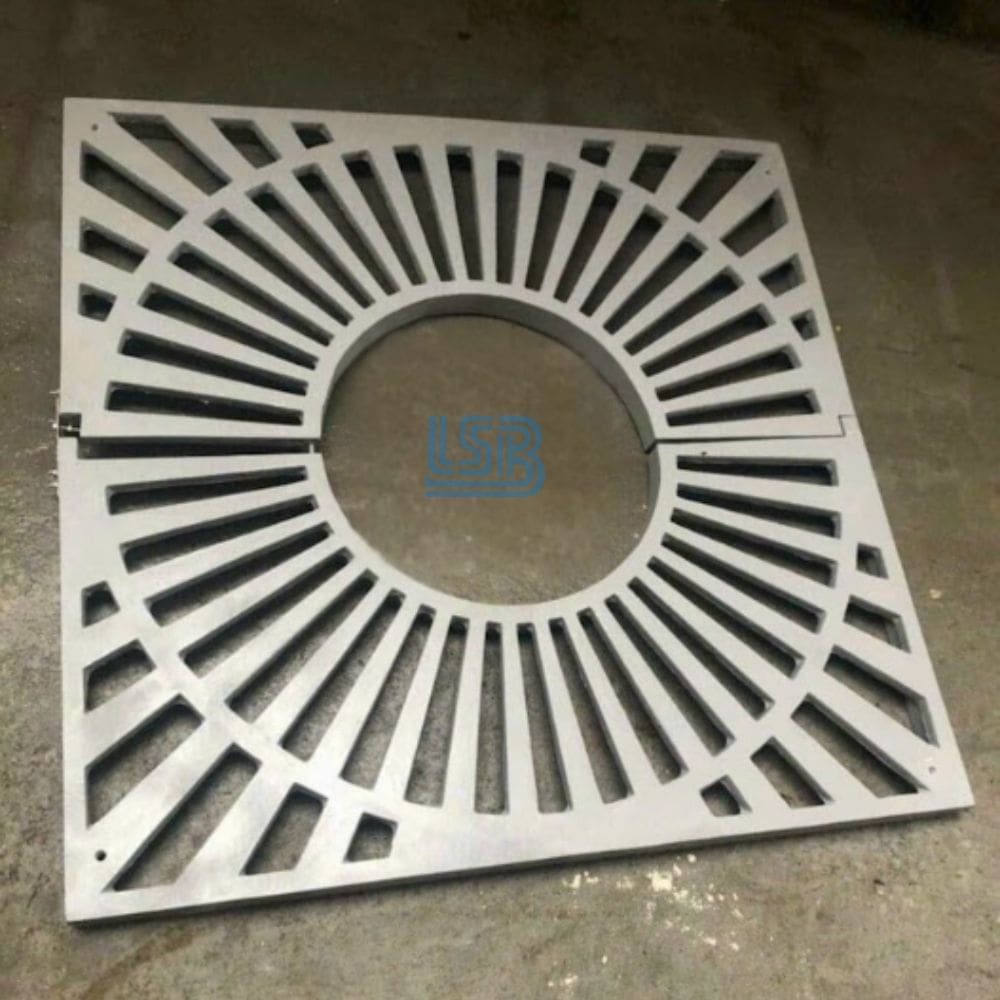 Đây là mẫu ghi bảo vệ gốc cây vuông, có kết cấu lắp ghép thông minh từ 4 mảnh hình quạt bằng khớp gài, giúp thi công nhanh chóng. Sản phẩm có thiết kế nan cong đồng tâm và được cung cấp với hai tùy chọn kích thước phổ biến: loại lớn 1250×1250 mm (ghép từ 4 mảnh 625×625 mm), lỗ tròn trung tâm đường kính 750 mm. Với độ dày khoảng 25−35 mm, sản phẩm đảm bảo độ bền và khả năng chịu lực tốt cho các không gian công cộng.