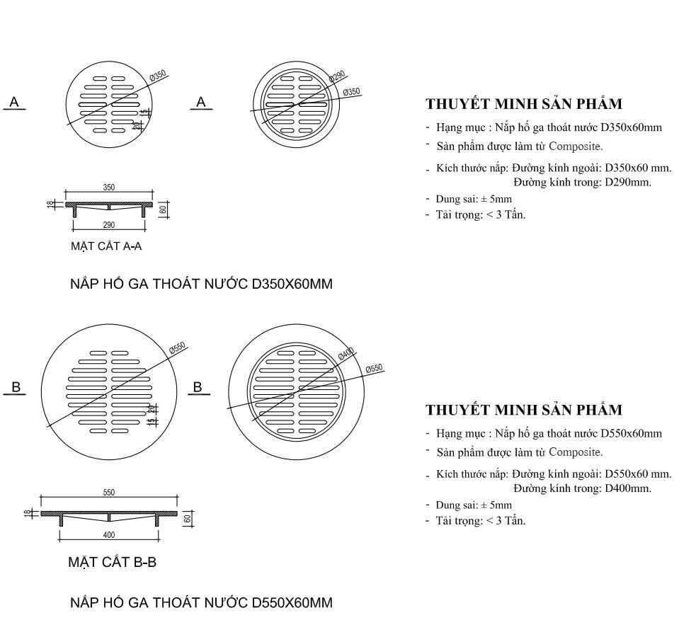 - Kích thước: Lựa chọn kích thước D350mm, D550mm hoặc các kích thước tùy chỉnh khác để vừa khít với hố thu nước, đảm bảo hiệu quả thoát nước và an toàn.