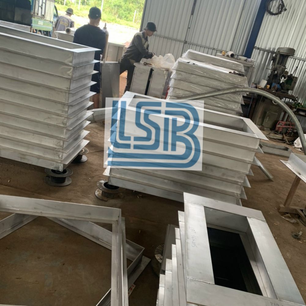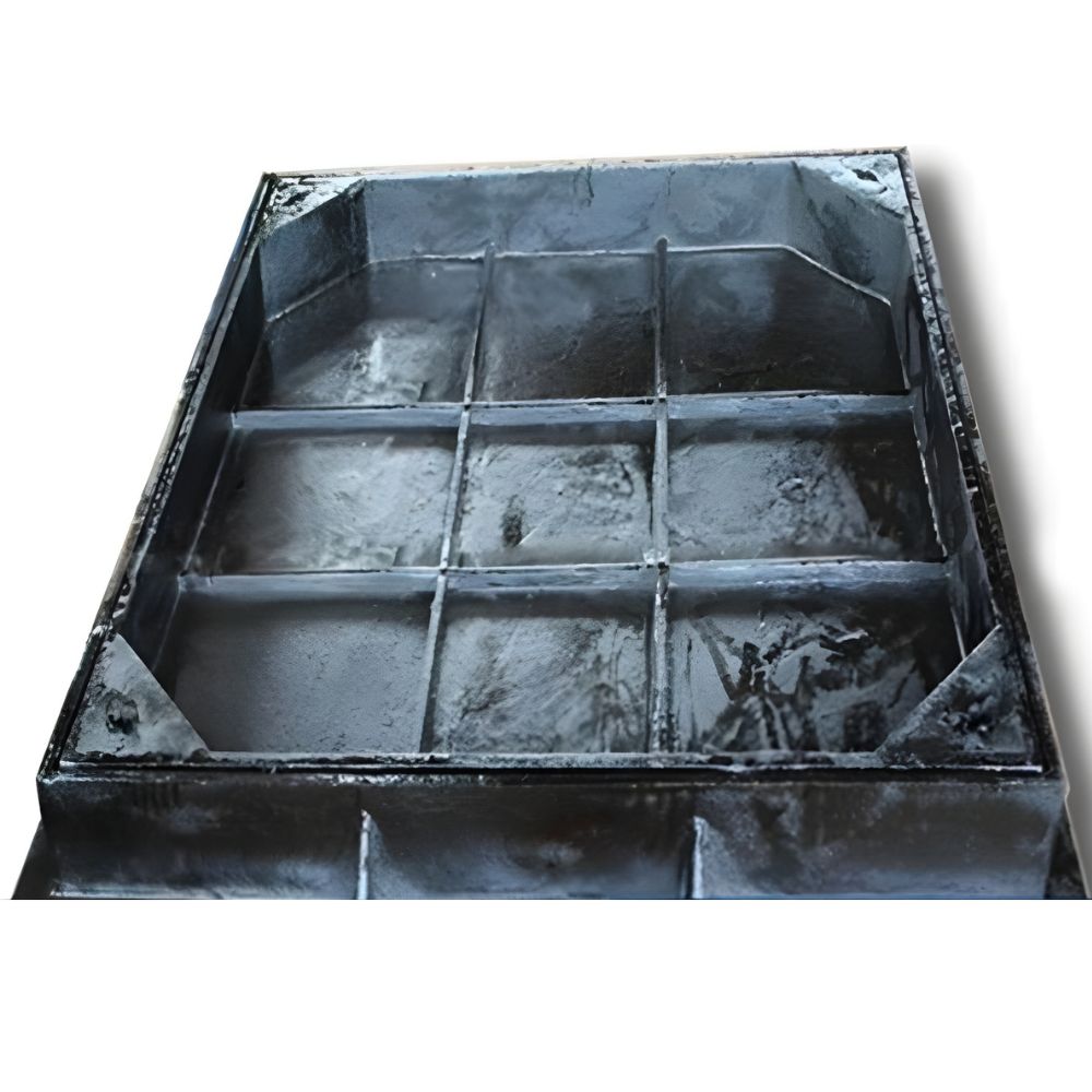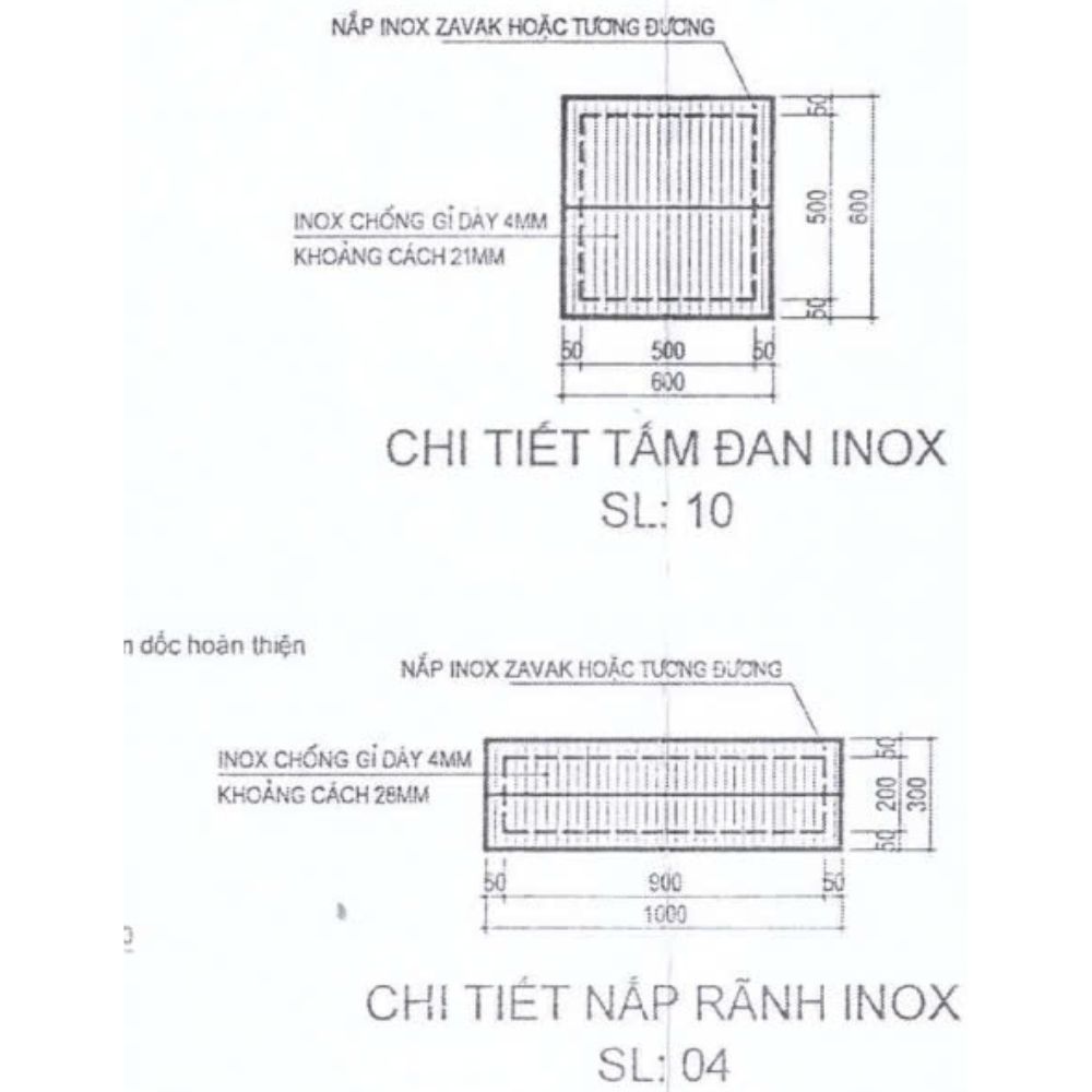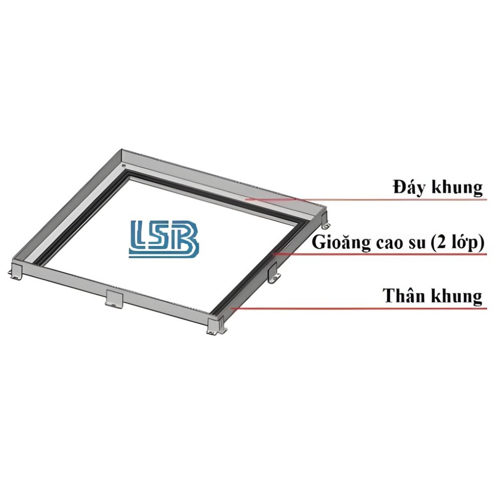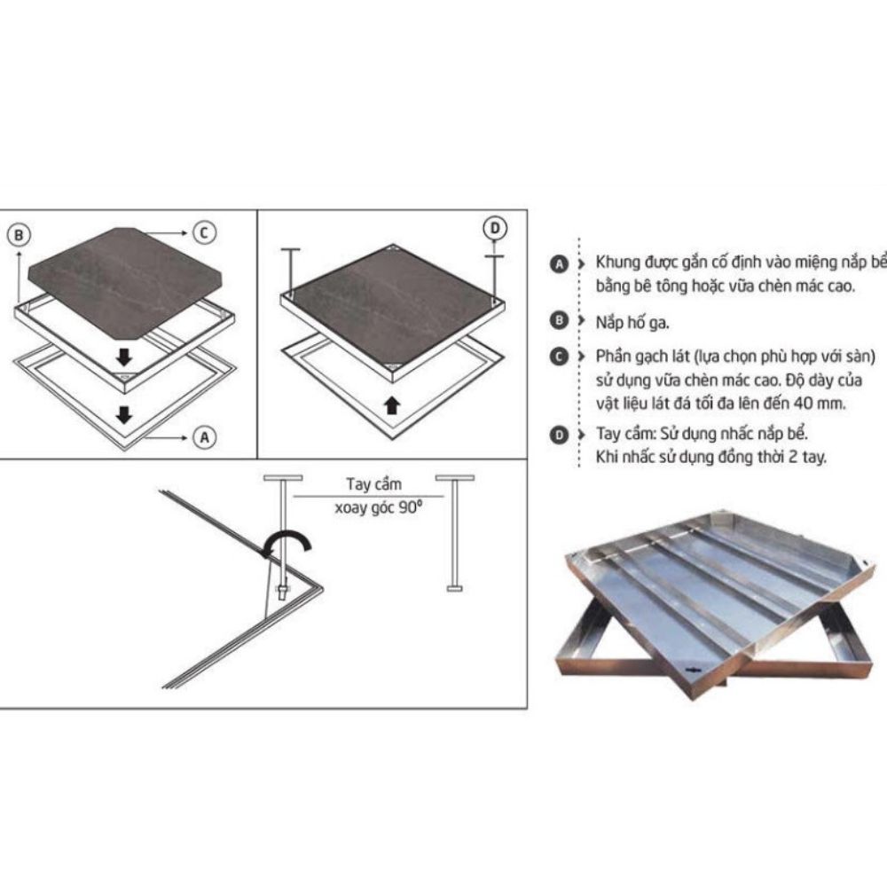 Phần khung đỡ phía dưới: được làm từ inox (SUS304/SUS201) hoặc thép tấm dày dặn, được hàn chắc chắn tạo thành một khung vuông hoặc chữ nhật vững chắc. Khung thường được hàn thêm các thanh móc thép hoặc tai cài để tăng khả năng bám dính, liên kết chặt chẽ vào lớp bê tông nền khi lắp đặt.